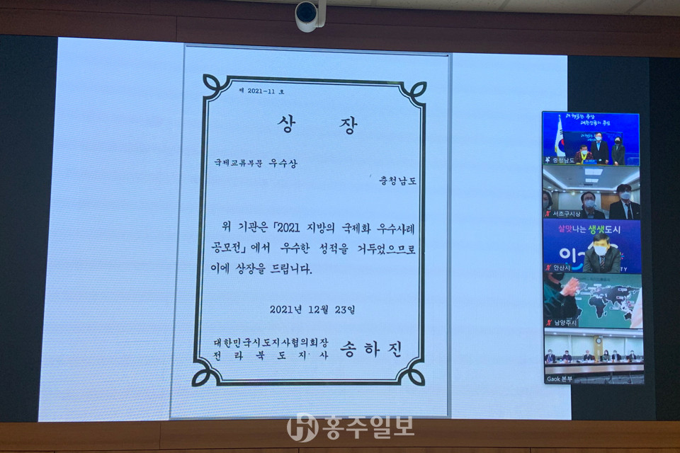 충남도는 지난 23일 비대면 온라인 방식으로 열린 ‘2021년도 지방의 국제화 우수사례 공모전’ 결선대회 결과, 우수상 수상의 영예를 안았다.<사진>