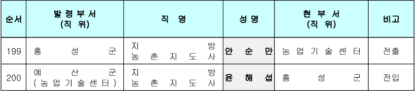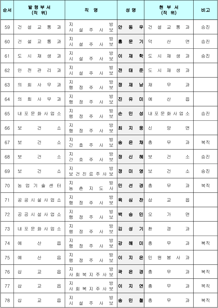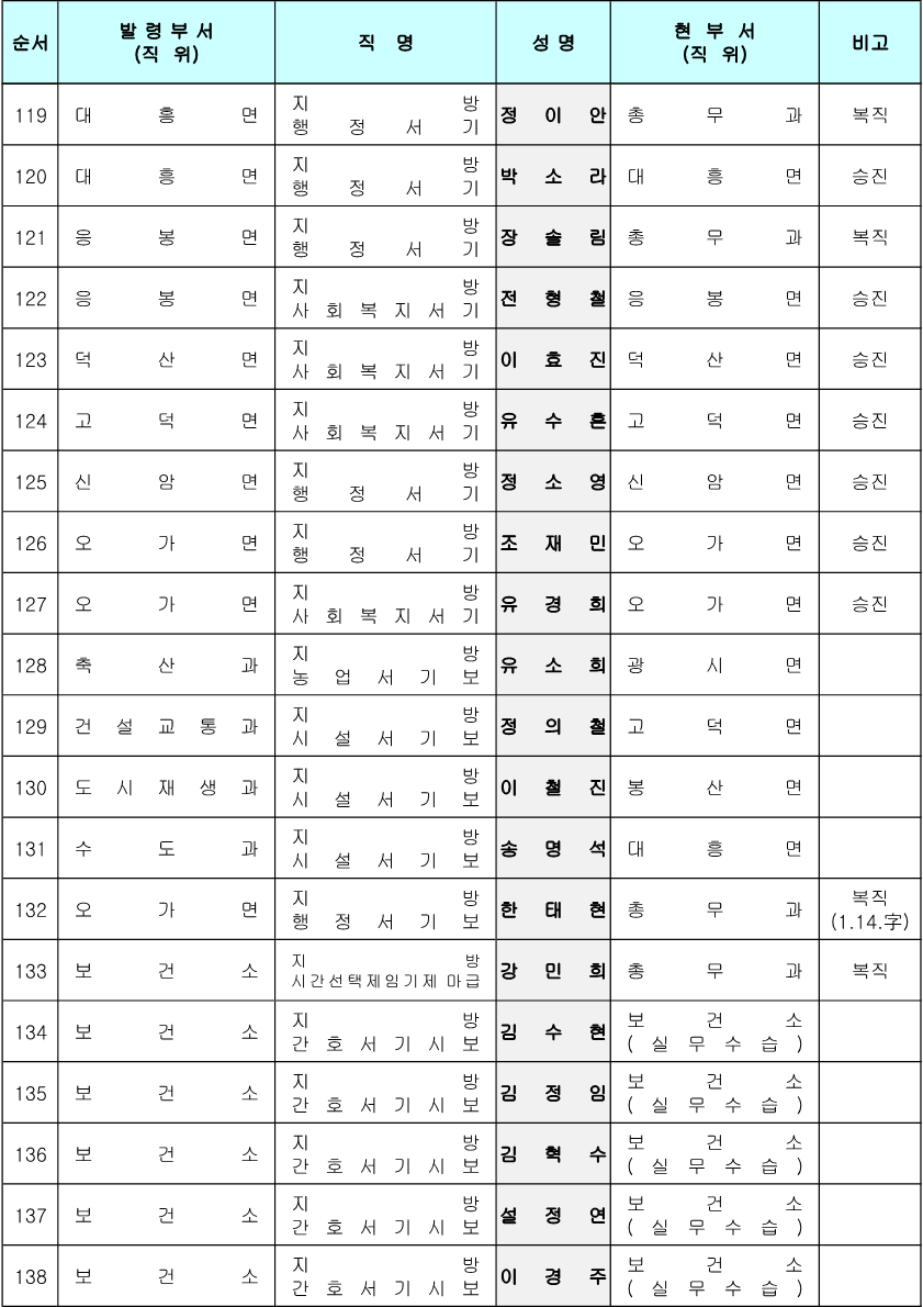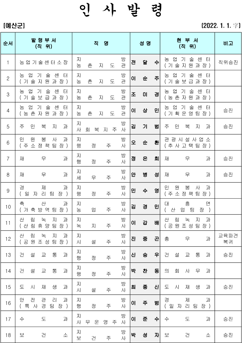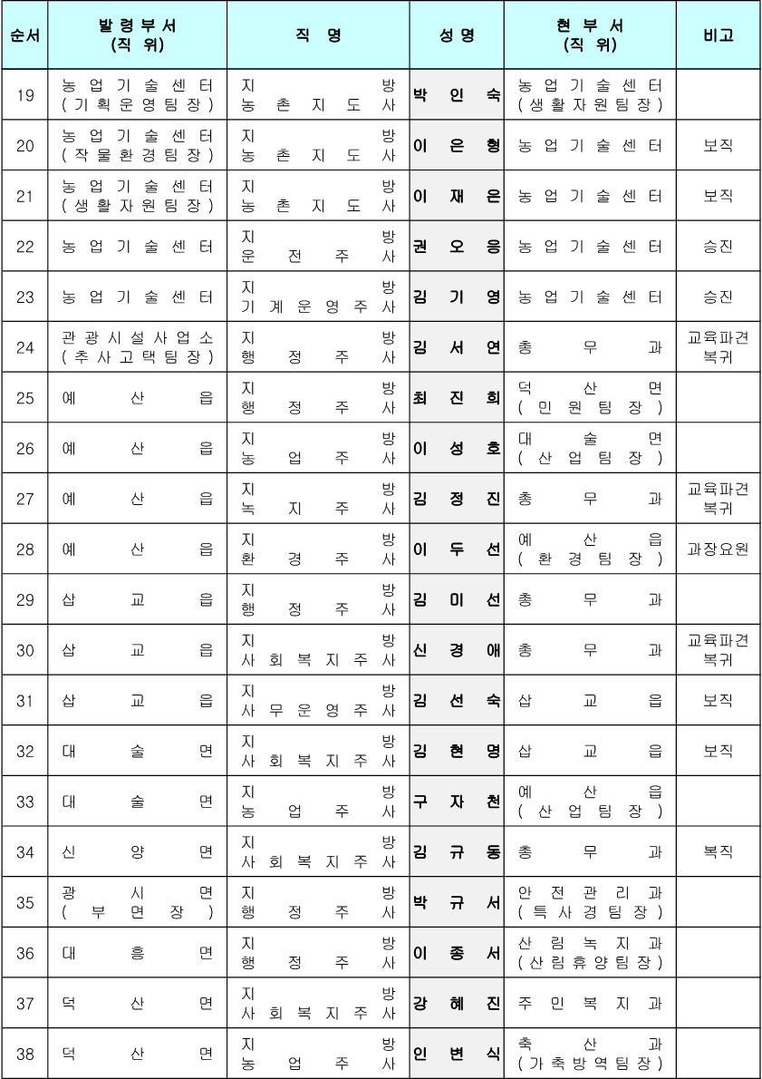 △민원봉사과 주소정책팀장 오순환 △경제과 일자리팀장 민수영 △축산과 가축방역팀장 김경민 △산림녹지과 산림휴양팀장 이갑배 △산림녹지과 공원조성팀장 진중곤 △건설교통과 박찬동 △안전관리과 특사경팀장 이주범 △농업기술센터 기획운영팀장 박인숙 △농업기술센터 작물환경팀장 이은형 △농업기술센터 생활자원팀장 이재은 △관광시설사업소 추사고택팀장 김서연 △예산읍 최진희 △예산읍 이성호 △예산읍 김정진 △예산읍 이두선 △삽교읍 김미선 △삽교읍 신경애 △삽교읍 김선숙 △대술면 김현명 △대술면 구자천 △신양면 김규동 △광시면 부면장 박규서 △대흥면 이종서 △덕산면 강혜진 △덕산면 인변식 △신암면 김성진