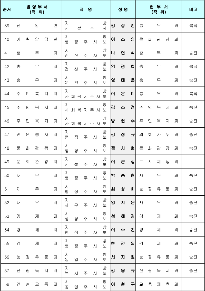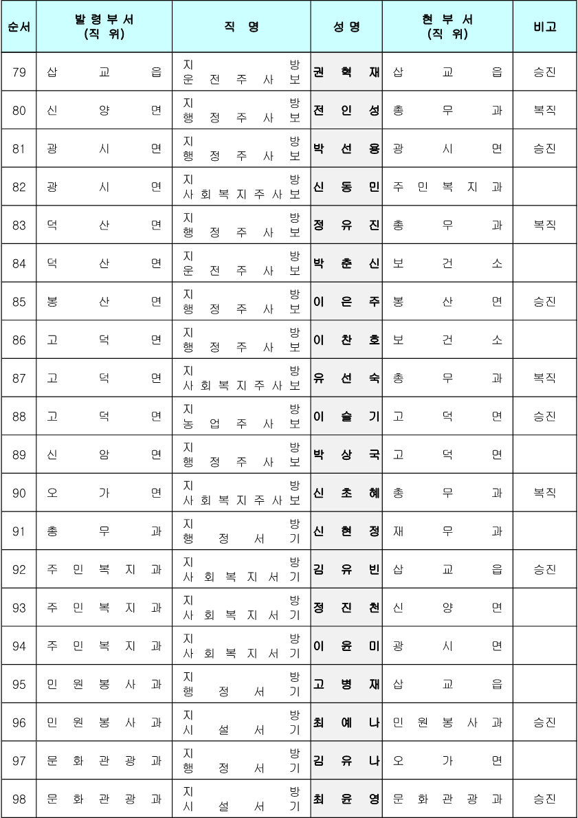 △총무과 신현정 △주민복지과 정진천 △주민복지과 이윤미 △민원봉사과 고병재 △문화관광과 김유나 △재무과 우희정 △경제과 박은혜 △경제과 한만재 △농정유통과 이지혜 △농정유통과 정지영 △농정유통과 박광수 △농정유통과 김민재 △건설교통과 정재훈 △도시재생과 조재영 △수도과 김민혁 △의회사무과 최진권 △보건소 이을희 △보건소 김성한 △대흥면 정이안 △응봉면 장솔림