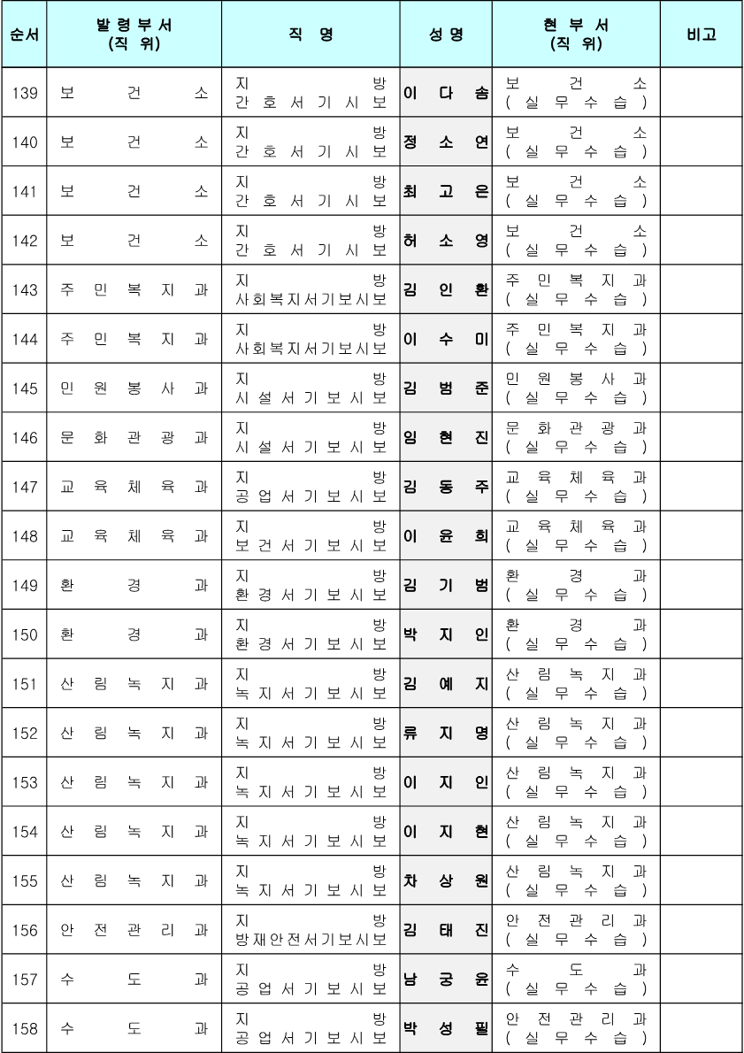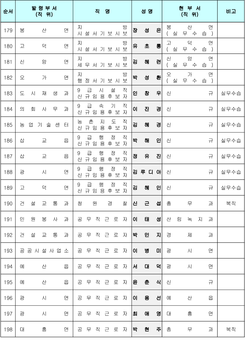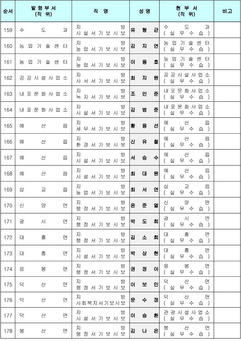 △보건소 김수현 △보건소 김정임 △보건소 김혁수 △보건소 설정연 △보건소 이경주 △보건소 이다솜 △보건소 정소연 △보건소 최고은 △보건소 허소영 △주민복지과 김인환 △주민복지과 이수미 △민원봉사과 김범준 △문화관광과 임현진 △교육체육과 김동주 △교육체육과 이윤희 △환경과 김기범 △환경과 박지인 △산림녹지과 김예지 △산림녹지과 류지명 △산림녹지과 이지인 △산림녹지과 이지현 △산림녹지과 차상원 △안전관리과 김태진 △수도과 남궁윤 △수도과 박성필 △수도과 유형균 △농업기술센터 김지연 △농업기술센터 이용호 △공공시설사업소 최지원 △내포문화사업소 조인준 △내포문화사업소 김범준 △예산읍 황용선 △예산읍 신유철 △예산읍 서승수 △예산읍 최대원 △삽교읍 최서연 △신양면 윤준열 △광시면 박도희 △대흥면 김소희 △대흥면 박상현 △응봉면 권정아 △덕산면 이보민 △덕산면 문수정 △덕산면 이승환 △봉산면 김나은 △봉산면 장성은 △고덕면 유초롱 △신암면 김혜련 △오가면 박성환