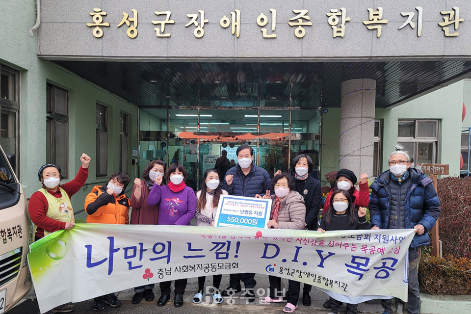 홍성군장애인종합복지관(관장 복천규)은 지난 24일 목공교실 종강식을 진행하고 작품전시회와 목공제품 바자회에서 얻은 수익금 55만 원을 관내 재가 장애인의 난방비로 복지관에 기부하는 행사를 가졌다.