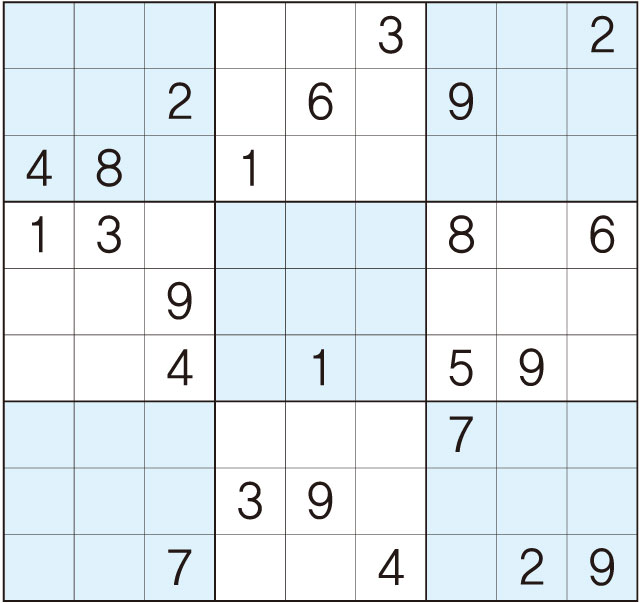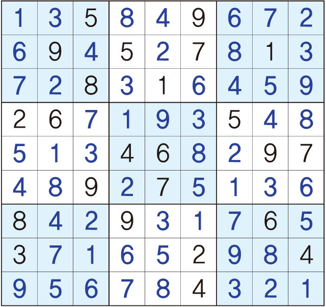 3. 큰 정사각형(9x9) 안에 있는 작은 정사각형(3x3) 안에는 숫자 1~9가 각 한 번씩 들어간다.