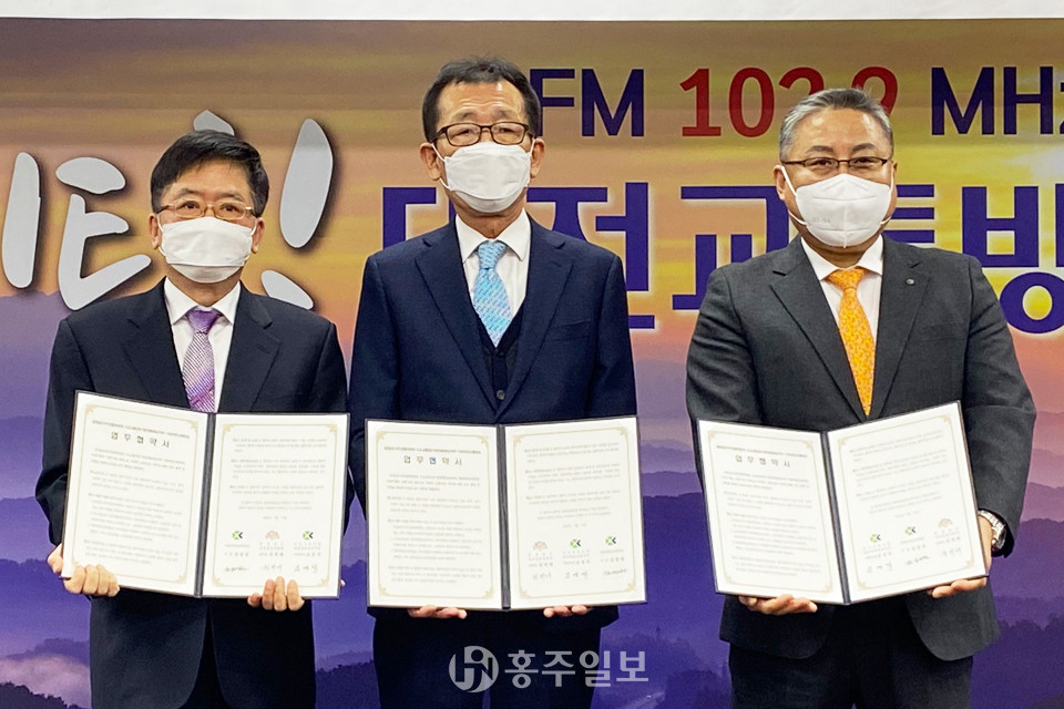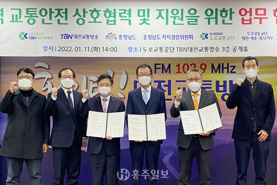 충남자치경찰위원회(위원장 권희태)는 11일 TBN대전교통방송 회의실에서 도로교통공단 대전세종충남지부, TBN대전교통방송과 교통사고 예방을 위한 업무협약을 체결했다.<사진>