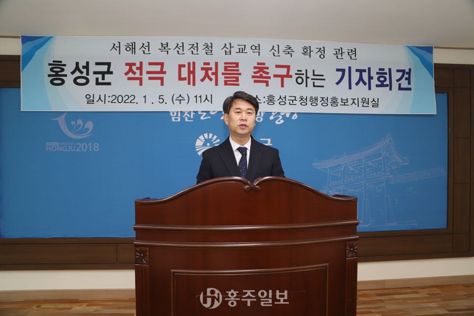 이상근 전 홍성군의회 의장(국민의힘)은 지난 5일 홍성군청 행정지원실에서 서해선 복선전철 장래역(이하 삽교역) 신설 확정 관련해 군의 적극 대처를 촉구하는 기자회견을 개최했다.<사진>
