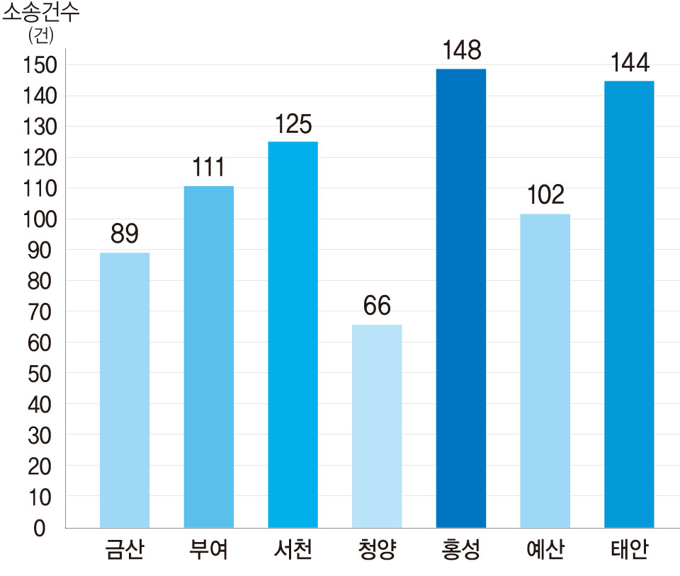 도내 15개 시·군에서 제공받은 민선7기 소송현황 자료를 살펴보면 군의 총 소송건수는 148건으로 도내 7개 군단위 기초자치단체 중 가장 높은 수치를 기록했으며 소송건수가 가장 적은 청양군과는 82건이 차이 났다.