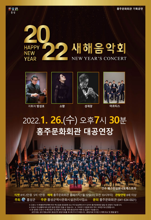 웨스턴심포니오케스트라, 가수 ‘소향’ 참여홍성군 홍주문화회관은 임인년 새해를 맞아 코로나19 시대를 벗어나 일상으로의 회복의 기원을 담은 ‘2022 새해 음악회’를 오는 26일 저녁 7시 30분에 개최한다.