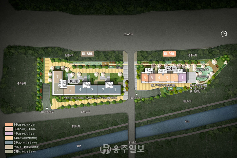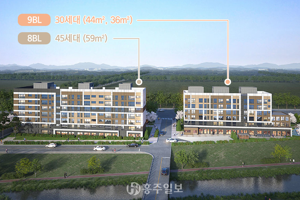 충남 꿈비채 홍성내포는 2개 동으로 101동(RL8)은 지하 1층~지상 7층으로 건설되며 36㎡와 44㎡형 45세대가 공급되고, 201동(RL9)은 지하 1층~지상 6층으로 건설되며 59㎡형 30세대가 공급된다. 입주는 오는 10월로 예정돼 있다.