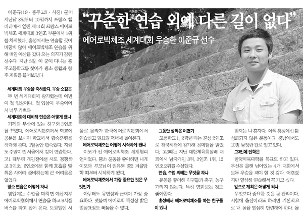 2009년 6월 10일자 본지 창간호에는 에어로빅체조 세계대회에서 우승을 차지한 홍주고 이준규 군의 인터뷰기사가 실렸다. 당시 이준규 군은 고3 학생으로서 한국체육대학에 진학해 대한민국 최고의 에어로빅 선수가 되고 싶다는 당찬 포부를 드러냈었다. 3년이 흐른 지금, 이준규 군은 어떻게 지내고 있을까?