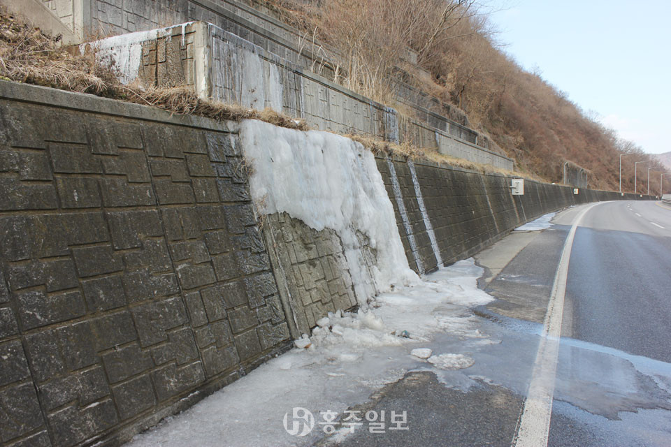 29번 국도인 홍성 남부순환로 마온터널 부근 도로 옆 계단식 옹벽에서 커다란 얼음 폭포가 발견됐다. 지난 17일 제보를 받고 찾은 현장은 옹벽에서 나온 물이 도로에 빙판까지 만들어 위태로운 모습을 연출하고 있었다.