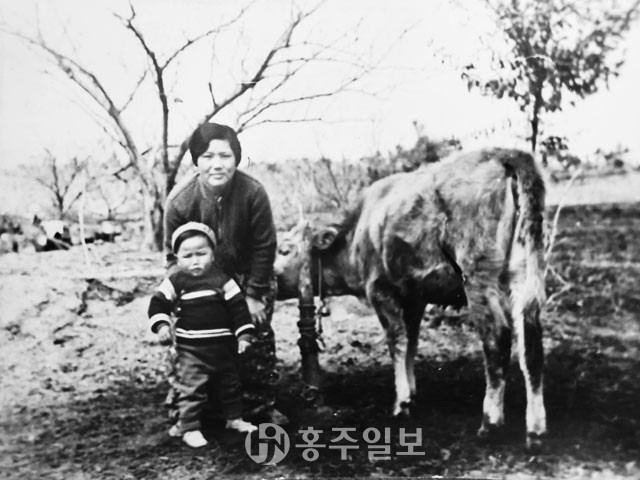 “나는 1968년에 당진에서 소향마을로 시집왔슈. 우리 큰 아들이 두 살 때니께 1970년이겠네유. 이 날 처음으로 집에 소가 생겼다고 기뻐하면서 안뜰에서 찍은 사진이에유. 제 뒤편에 시아버지가 심은 감나무도 보이네유.”