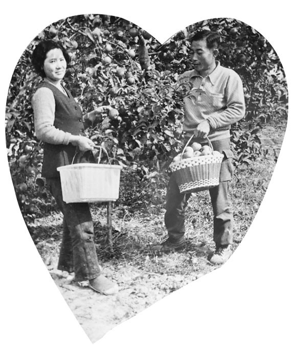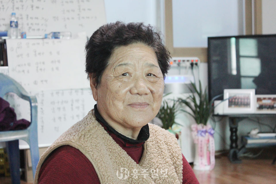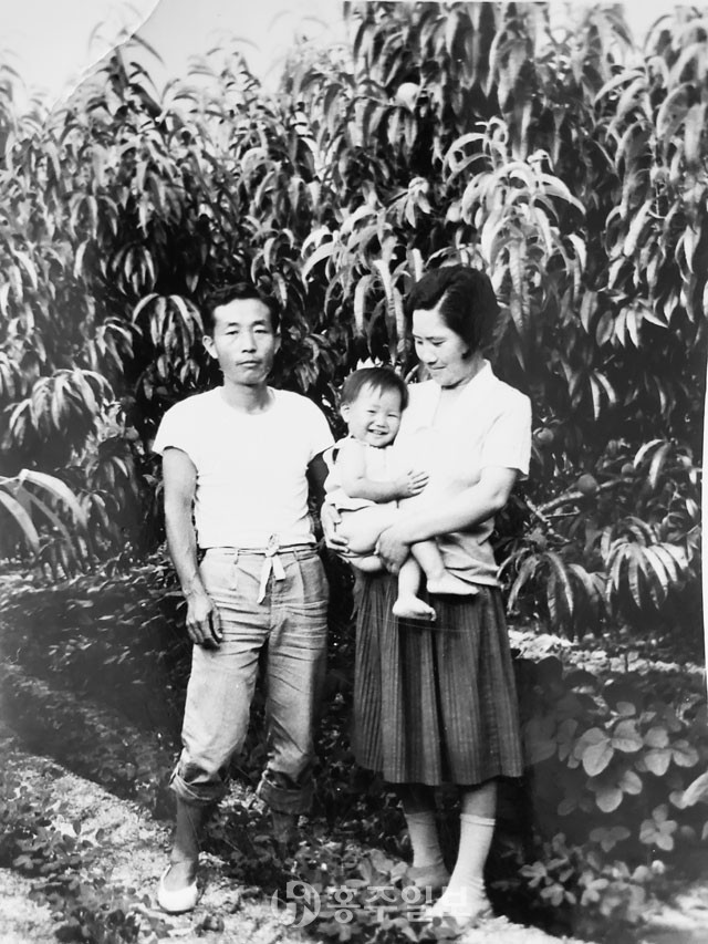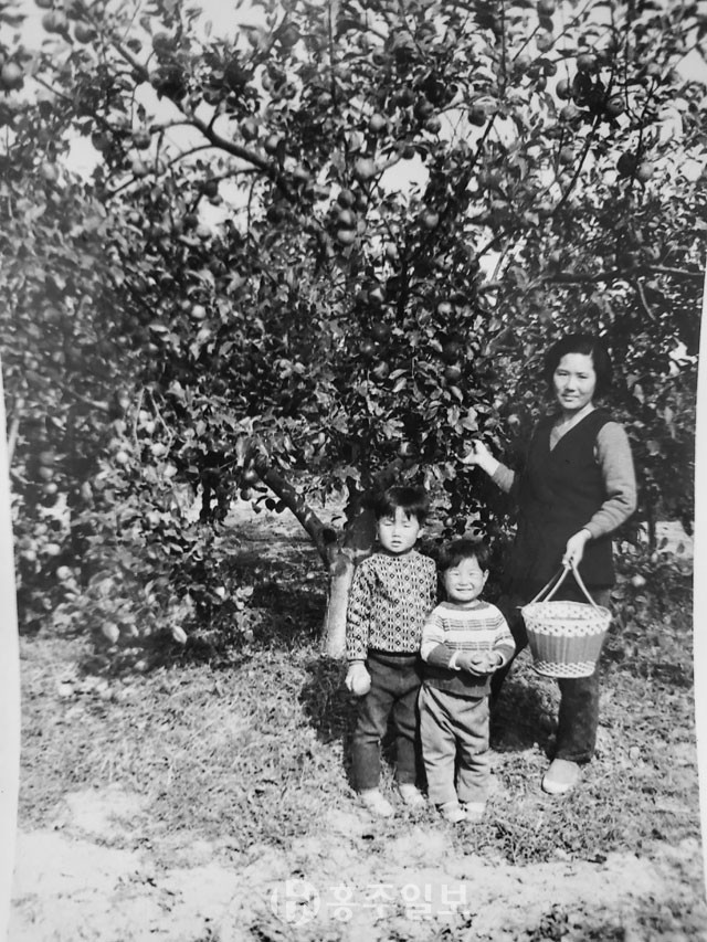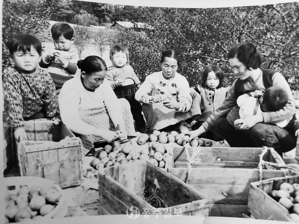 “시어머니도 보이고, 우리 이웃들도 있구먼유. 셋째 아들 동식이는 젖을 먹고 있네유. 지금은 문을 닫았지만 오래전 사과 과수원을 운영했어유. 사과를 수확한 가을엔 이렇게 이웃들과 함께 모여서 사과꼭지를 땄쥬.”
