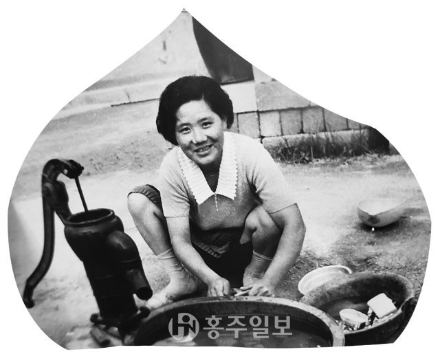 마중물 펌프로 끌어올린 지하수로 빨래를 하고 있는 젊은 시절의 김순옥 여사.