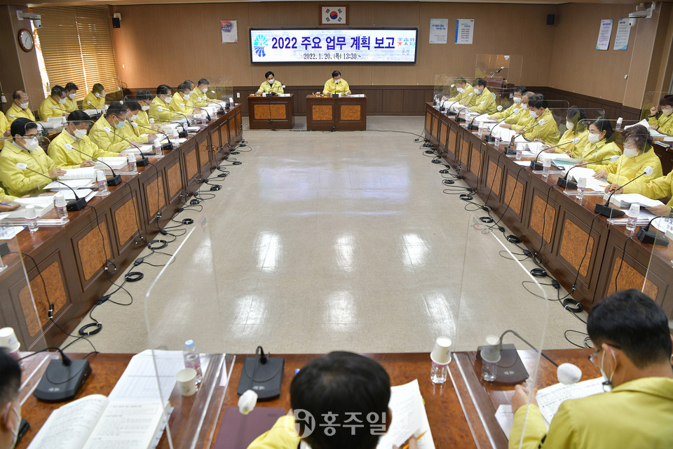 홍성군이 지난 20일 군청 회의실에서 김석환 군수, 길영식 부군수를 비롯한 국장‧담당관‧과장, 직속기관‧사업소장 등이 참석한 가운데 2022년 주요 업무계획 보고회를 개최했다.<사진>