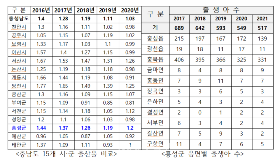 2020년 기준 군의 합계출산율(가임기 여성이 낳을 것으로 기대되는 출생아 수를 의미)은 1.2명으로 2019년 대비 0.1명 증가를 기록했다. 이는 전국 평균 0.83명, 충남 1.02명을 웃도는 수치로 도내 군 단위 지역 중 가장 높은 수치다. 그러나 2017년 이후 출생아 수는 꾸준히 감소해왔으며 특히 8개 면 지역은 지난 5년간 출생아 수 11명 이하를 기록했다.