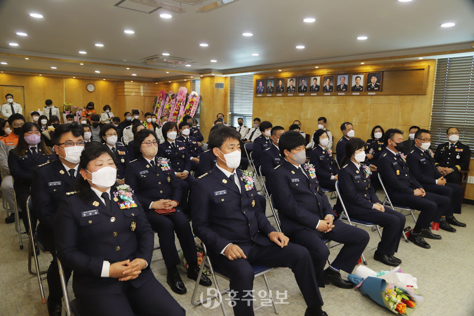 홍성소방서(서장 김성찬)는 지난 21일 소방서 본관 3층에서 김성찬 서장, 조승만 도의원, 한광윤 홍성읍장 등 40여 명의 내·외빈이 참석한 가운데 ‘홍성군 의용소방대장 합동 이·취임식’을 개최했다.