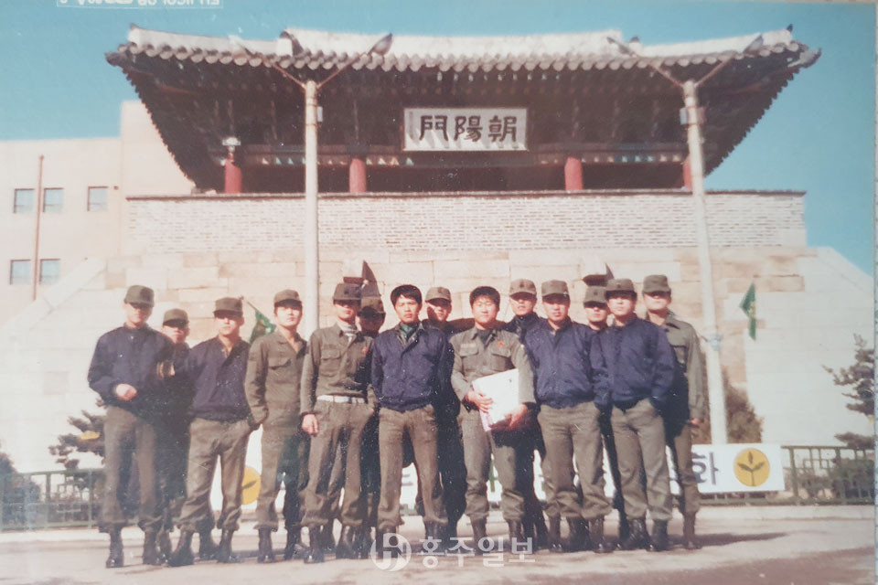 “이때가 아마 전우 중에 하나가 전역했을 때일꺼여. 얘던가? 뒤에는 조양문이여. 지금하고 다르게 나무가 있잖아. 그땐 그랬어.”
