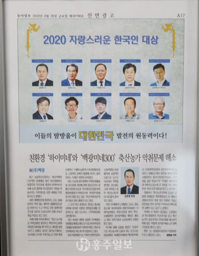 지난 2014년 설립한 ㈜백광은 천연발효제 ‘생균제(보조사료·셀링)’와 ‘미네랄(미네300)’의 악취제거제를 비롯해 자동안개분무·순환 시스템, 슬러지피트 청소사업 등으로 관내 축산악취 저감에 적극 앞장서고 있다. 이를 통해 가축의 면역력 증대와 소화력 향상, 성장 발육에 실질적인 도움을 주고 있다는 평가에 농가 소득증대는 물론 악취 민원 감소에도 크게 기여해 축산농가로부터 러브콜이 쏟아지고 있다.