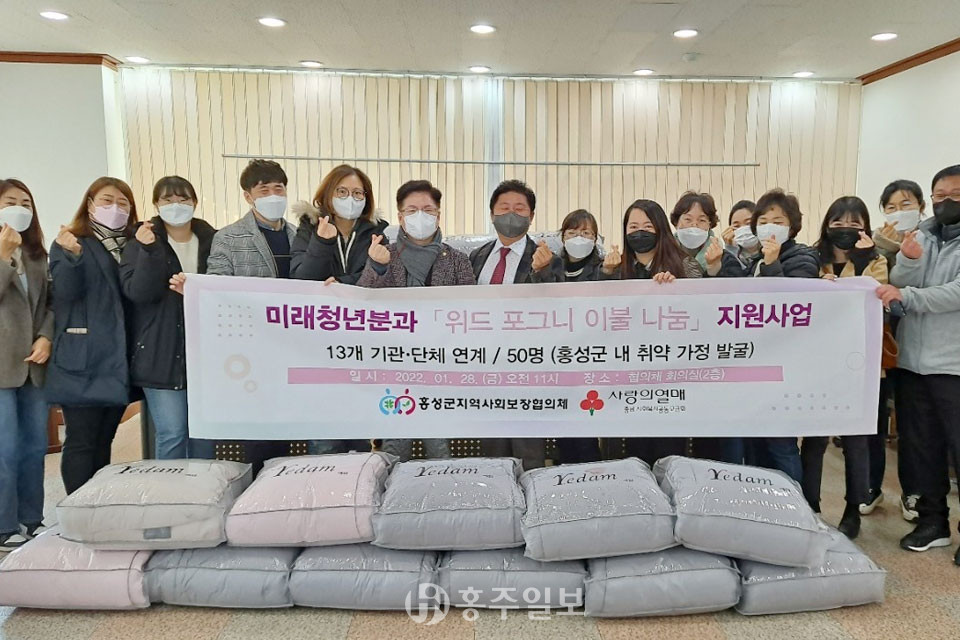 설 명절을 맞아 홍성군지역사회보장협의체(공동위원장 정윤)는 지난달 28일 관내 복지사각지대 취약 아동청소년 50여 가정에 400만 원 상당의 포그니 이불을 전달했다.<사진> 홍성군지역사회보장협의체는 이번 행사의 대상이 된 50여 가정을 관내 13개 기관·단체와의 연계를 통해 선정했다.