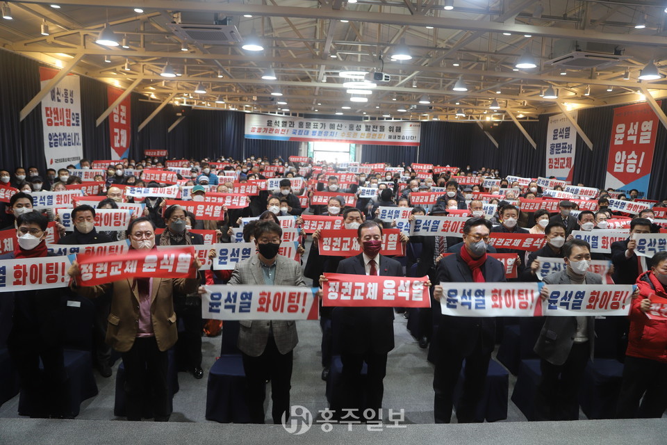 국민의힘 홍성·예산 당협 선거대책위원회(충남공동총괄선대위원장 홍문표·정진석)는 지난 5일 예산군 덕산스파뷰호텔에서 300여 명의 당원이 참석한 가운데 윤석열 후보의 승리를 결의하는 필승결의대회를 개최했다.