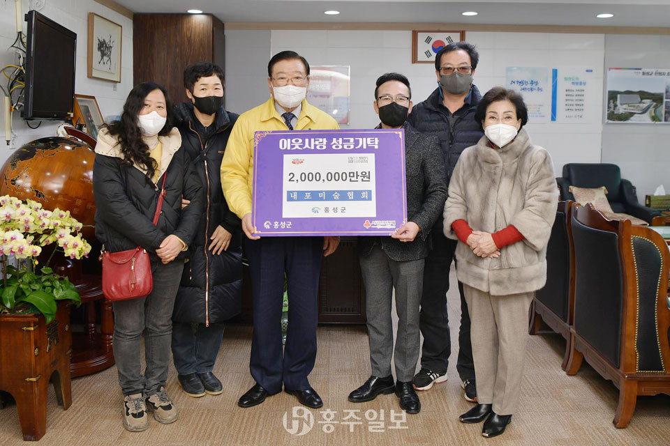 내포미술협회(대표 이헌용)은 협회 소속 작가들의 ‘사랑나눔 소품마켓전’을 통해 모은 기금 중 200만 원을 어려운 이웃을 위해 써달라며 지난달 28일 홍성군에 기탁했다.<사진> 군은 이번 성금을 저소득층 긴급지원 등에 사용할 예정이다.