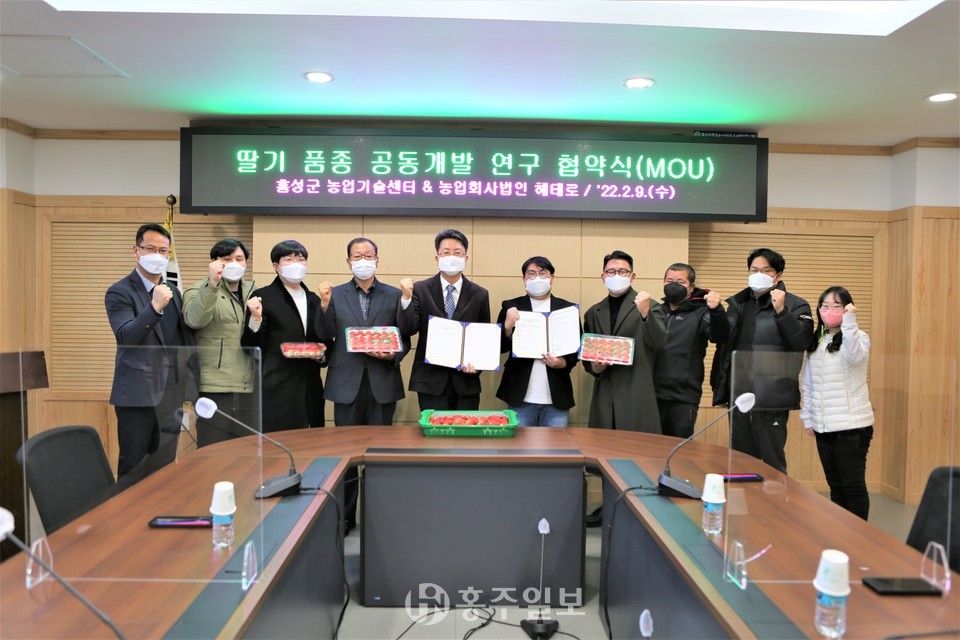홍성군농업기술센터(소장 이승복)와 딸기육종 민간전문기업 농업회사법인 헤테로(대표 최이영)가 지난 9일 신품종 개발을 위한 공동 연구개발 협약을 체결했다.<사진>