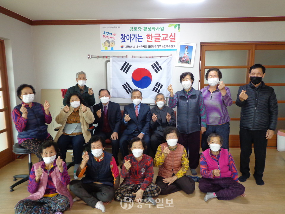 대한노인회 홍성군지회(지회장 조화원)는 지난 8일 홍성읍 송월경로당에서 ‘찾아가는 한글교실’을 개강했다.<사진>