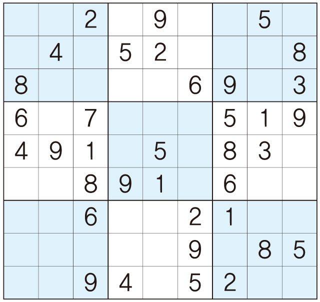 3. 큰 정사각형(9x9) 안에 있는 작은 정사각형(3x3) 안에는 숫자 1~9가 각 한 번씩 들어간다.