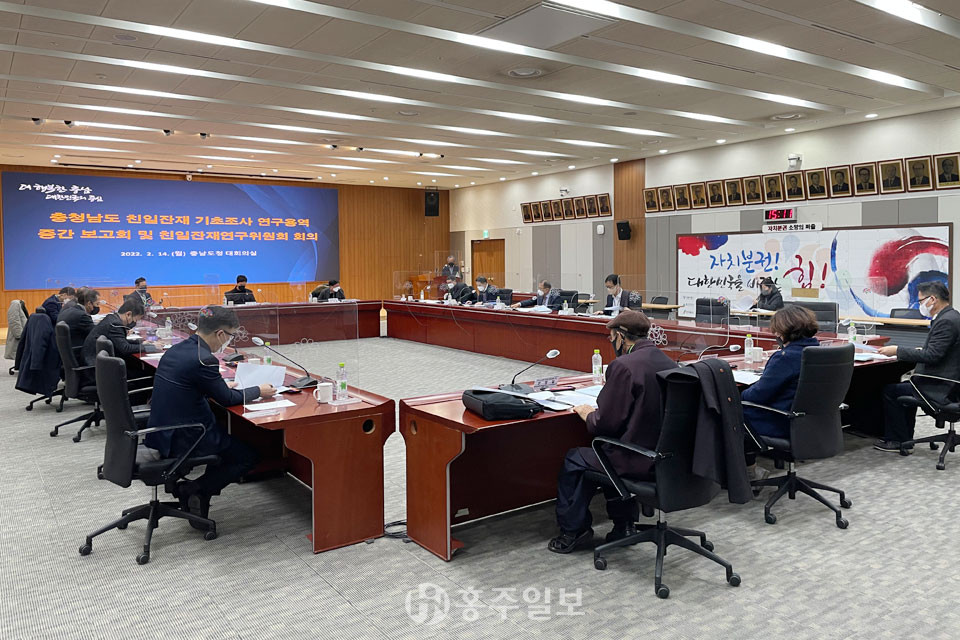 충남도는 지난 14일 도청 대회의실에서 충청남도 친일잔재연구위원회(이하 위원회) 제1차 회의 및 위촉식을 개최했다. 도 친일잔재연구위원 등 20여 명이 참석한 가운데 연 이번 회의는 위촉식, 연구용역 중간 보고, 토론 등의 순으로 진행했다.<사진>