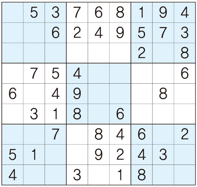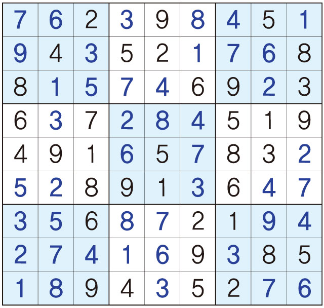 3. 큰 정사각형(9x9) 안에 있는 작은 정사각형(3x3) 안에는 숫자 1~9가 각 한 번씩 들어간다.