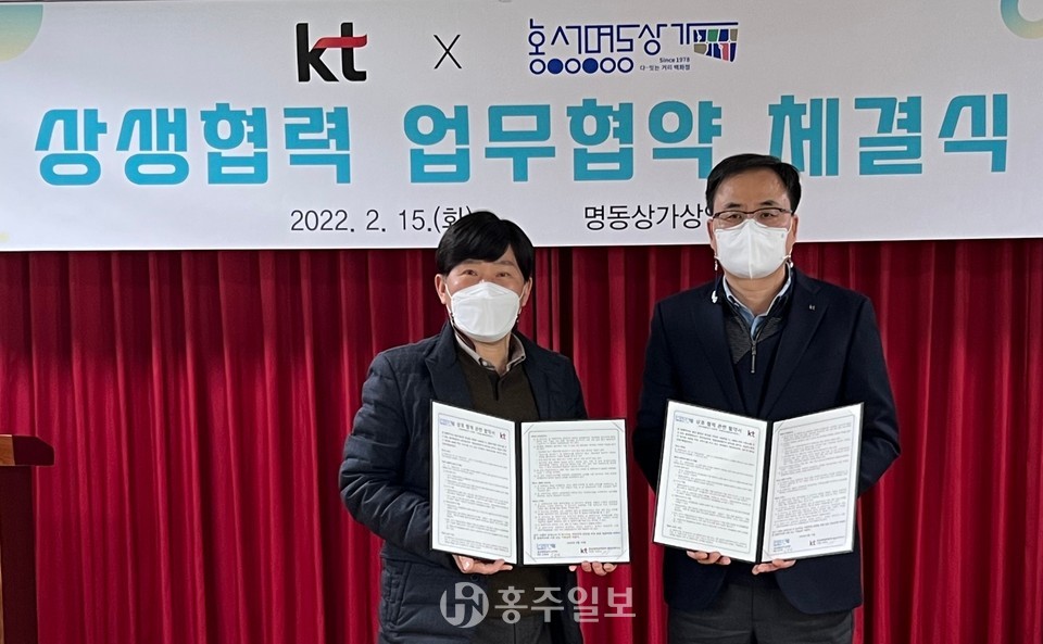 명동상가상인회(회장 김병태)와 KT충남·충북광역본부(광역본부장 이현석)가 홍성명동상가를 손님들이 안심하고 밖에 나와 즐길 수 있는 거리로 만들기 위해 지난 15일 손을 맞잡았다.<사진>