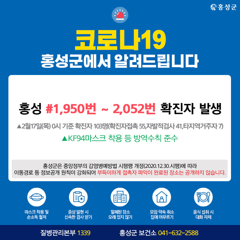 홍성 #1,950번 ~ 2,052번 확진자 발생