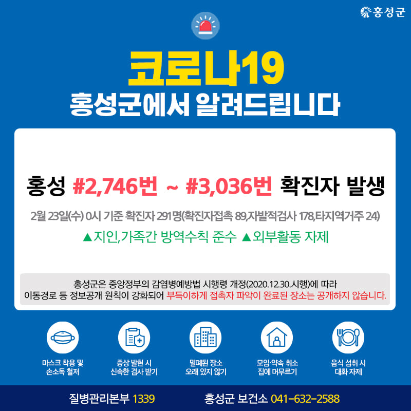 홍성 #2,746번 ~ #3,036번 확진자 발생