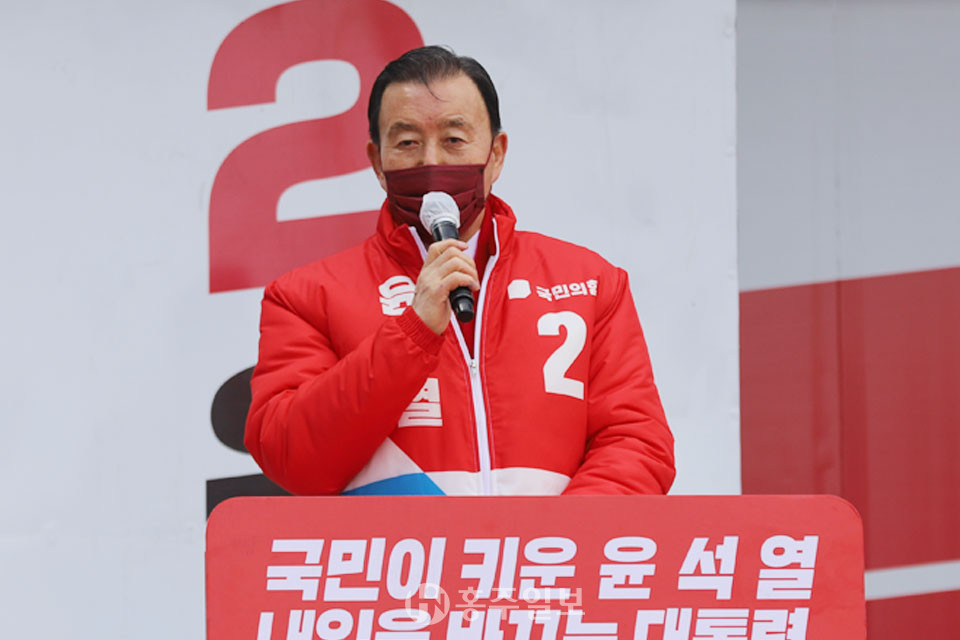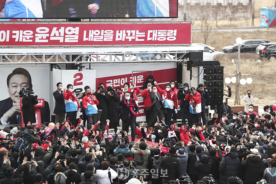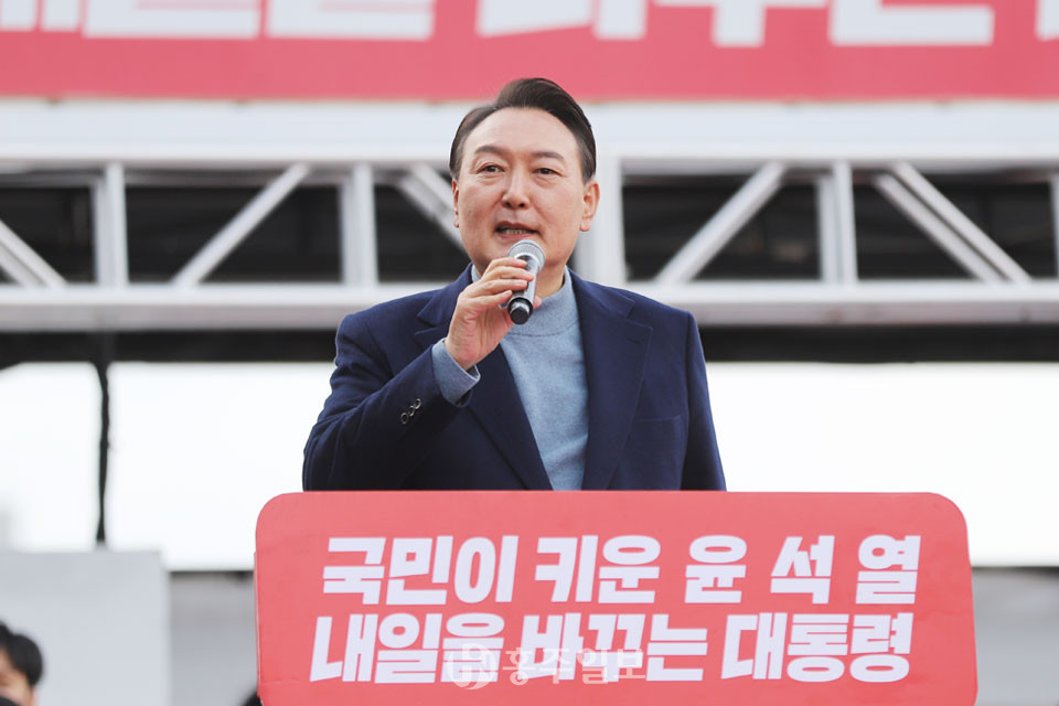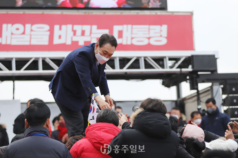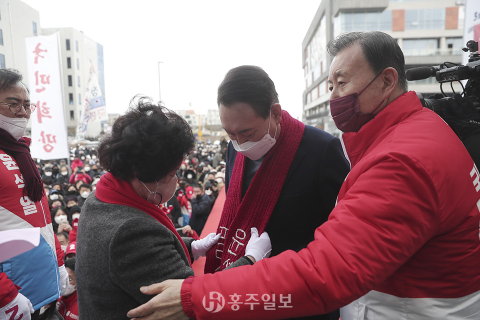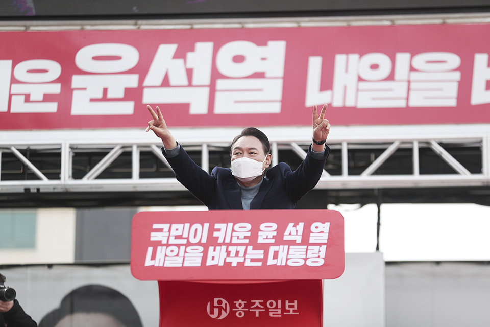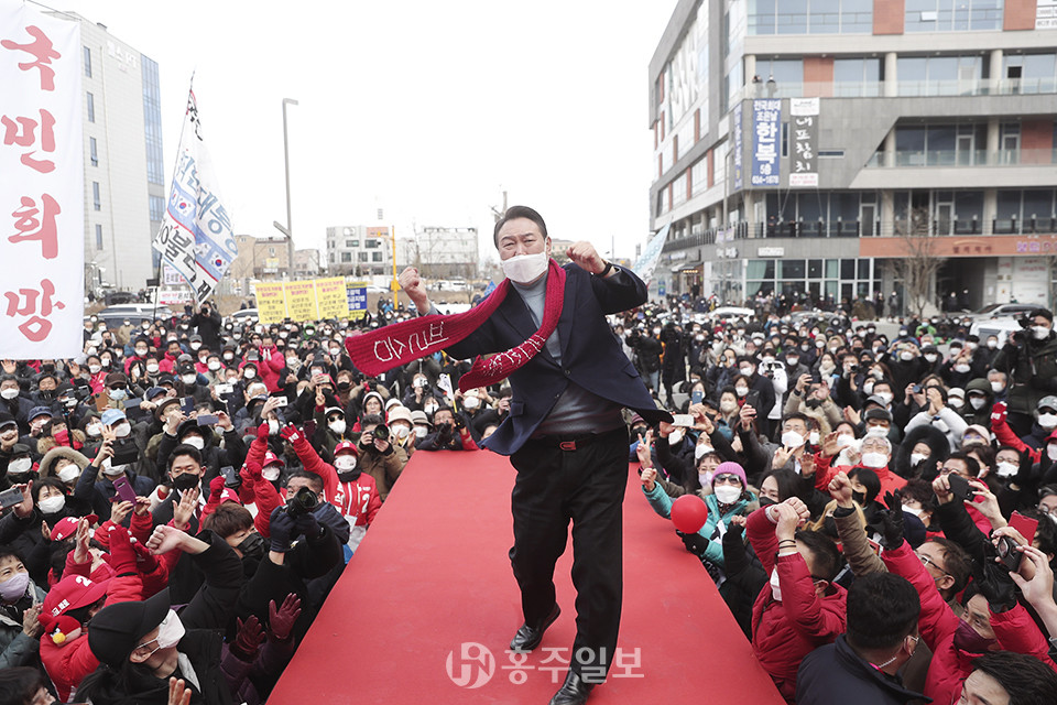 윤석열 국민의힘 대선후보는 지난 22일 오후 충남도청 내포신도시 중심상가 광장에서 바닥 민심잡기에 나섰다.
