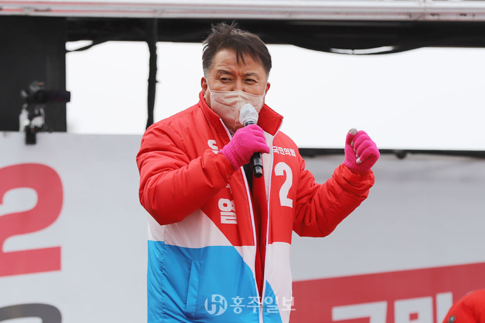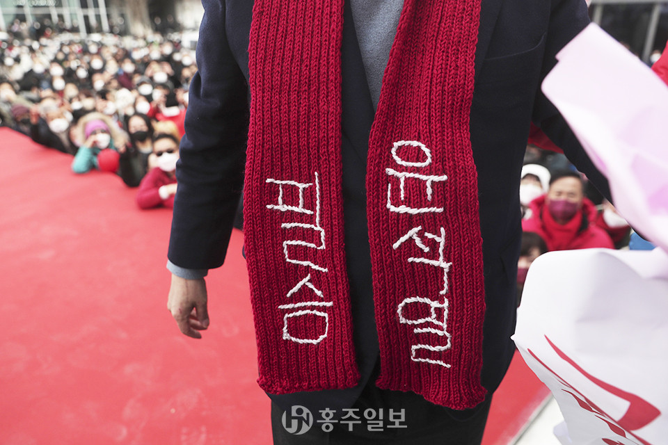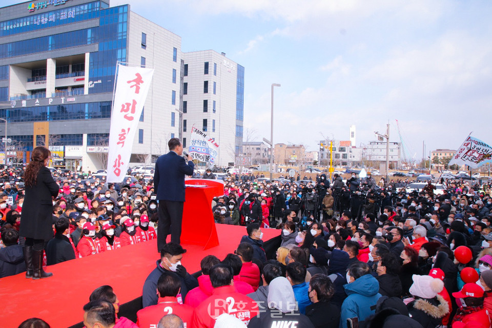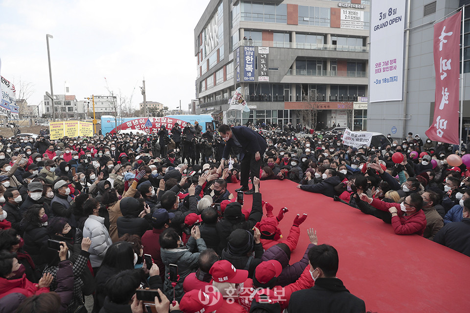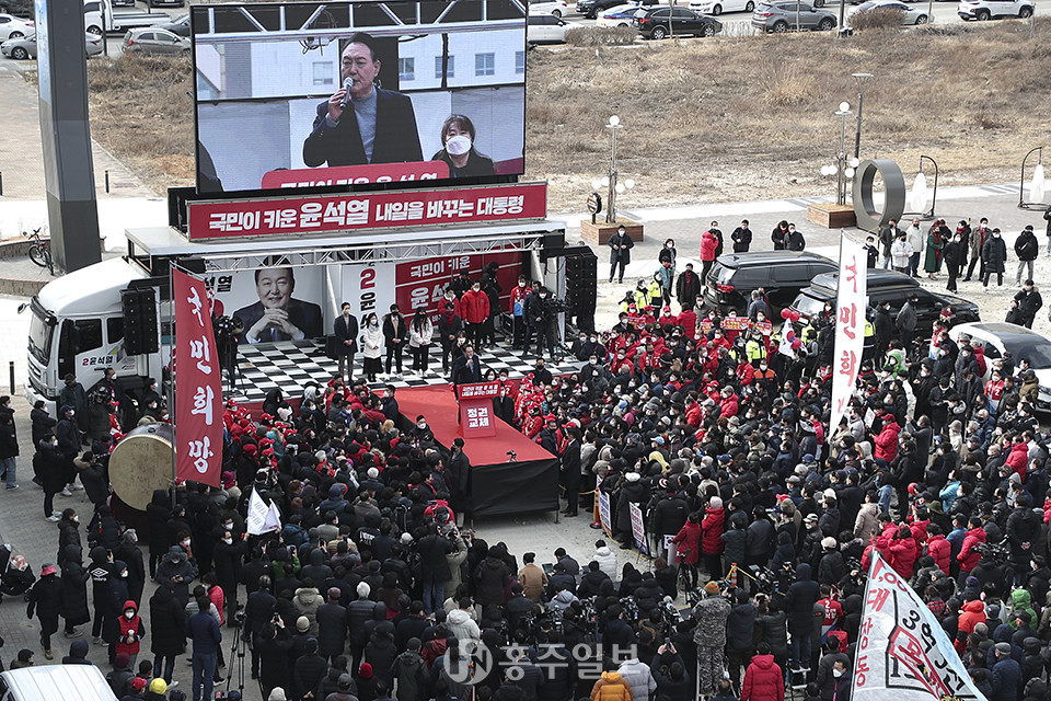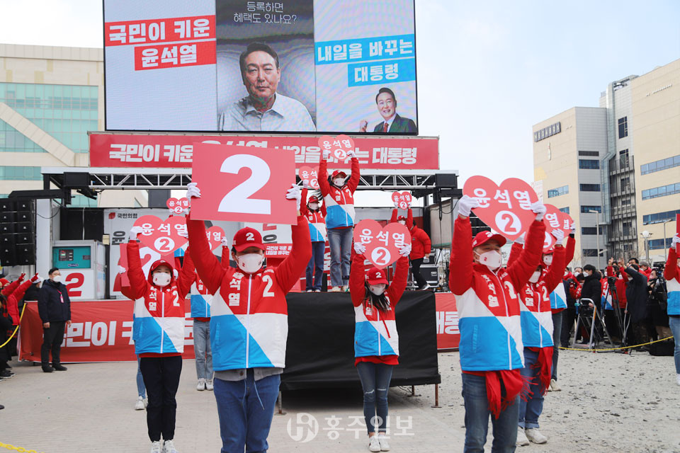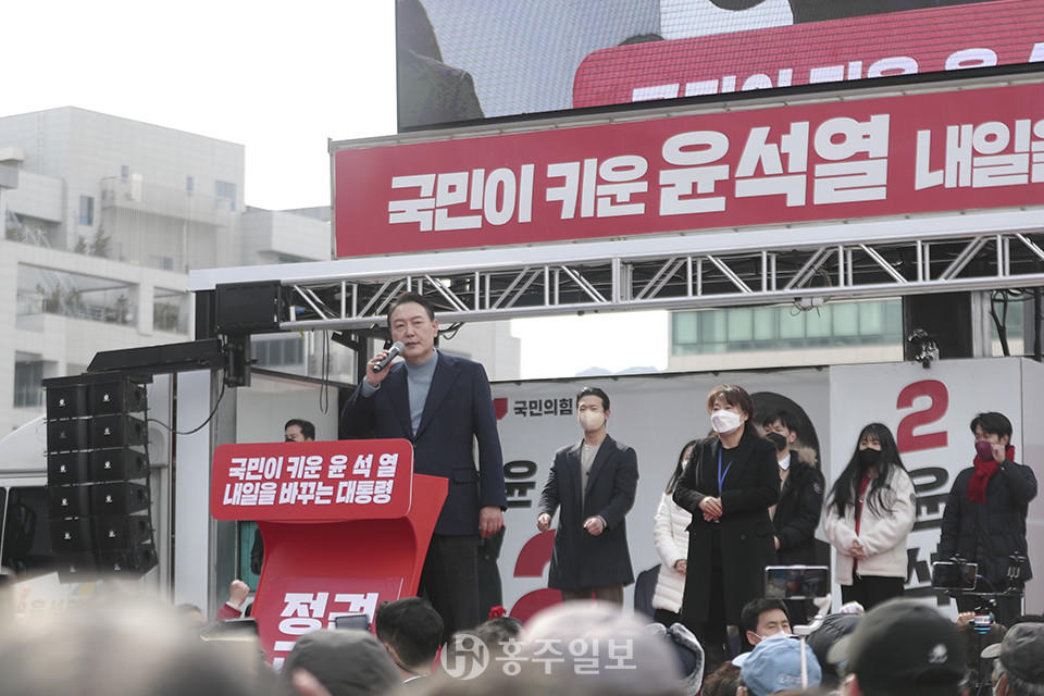 윤 후보는 “한용운 선사와 김좌진 장군의 본영인 홍성에서 여러분 앞에 서니 감개가 무량하다”며 “왜 여러분께서 정치초심자인 저를 이곳까지 서게 만들었는지 알 것 같다”고 말하자 지지자들은 ‘정권교체’를 외치며 호응을 보냈다.