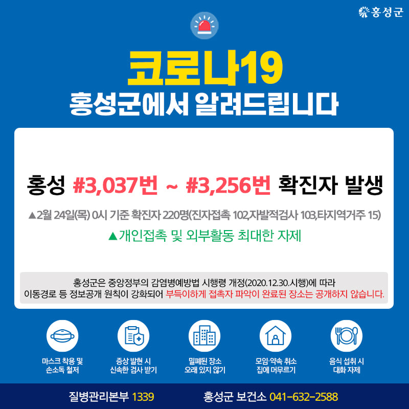 홍성 #3,037번 ~ #3,256번 확진자 발생