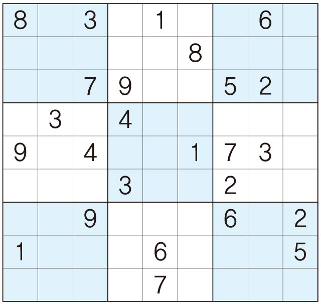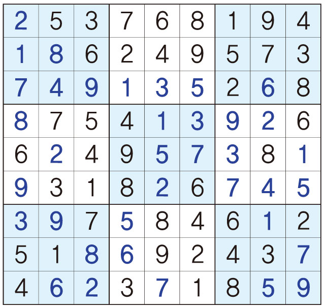 3. 큰 정사각형(9x9) 안에 있는 작은 정사각형(3x3) 안에는 숫자 1~9가 각 한 번씩 들어간다.