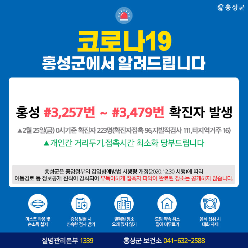 홍성 #3,257번 ~ #3,479번 확진자 발생