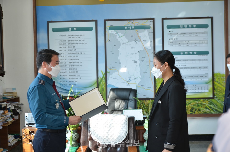 홍성경찰서(서장 이만형)가 지난 25일 결성농협을 방문해 전화금융사기 피해를 예방한 직원 A씨에게 감사장을 수여했다.<사진>