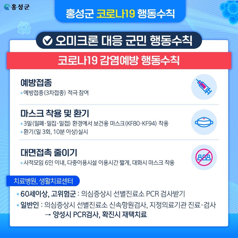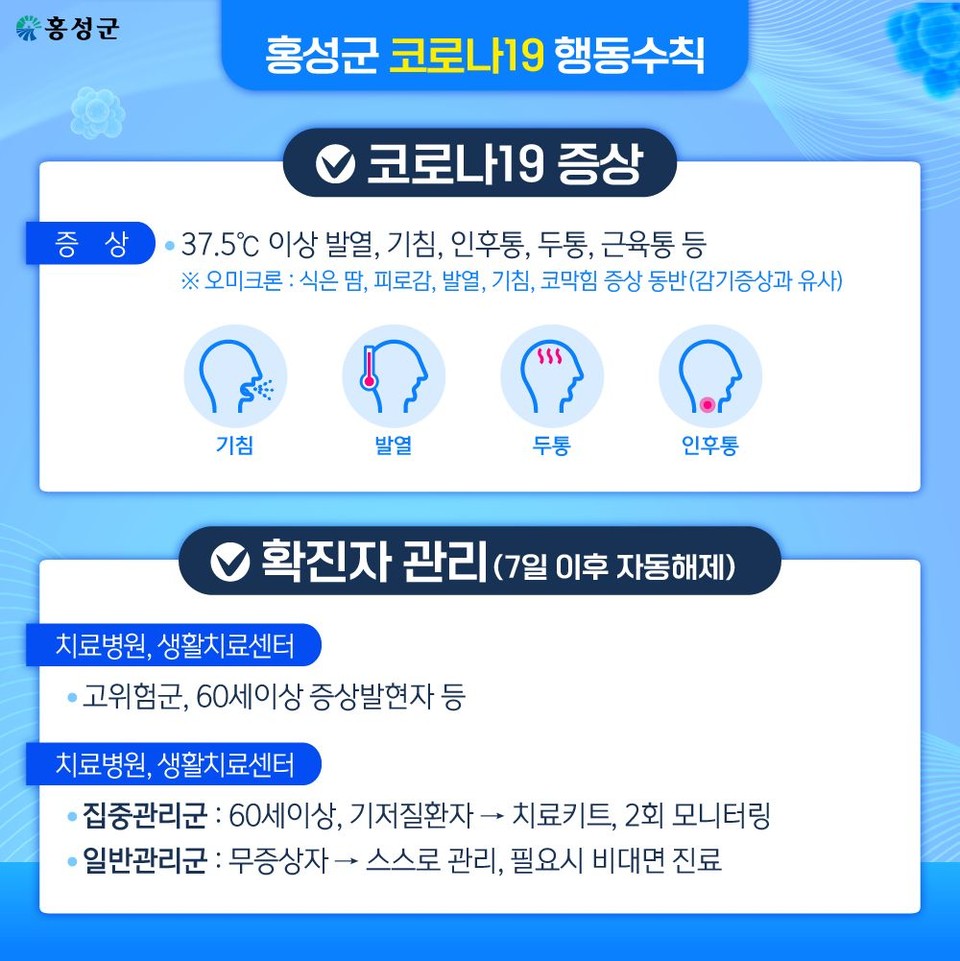 홍성군민 여러분께서는 코로나19 행동수칙을 숙지해 가족 등 확진자(의심자) 발생시 다음과 같이 조치해 주시기 바랍니다.
