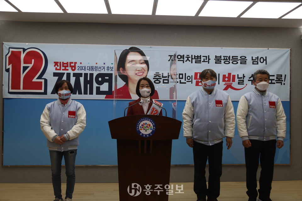 김재연 진보당 대선후보가 지난 24일 충남도청 브리핑룸에서 ‘지역 차별과 불평등을 넘어 충남도민의 땀이 빛날 수 있도록’이라는 주제로 기자회견을 열었다.<사진>