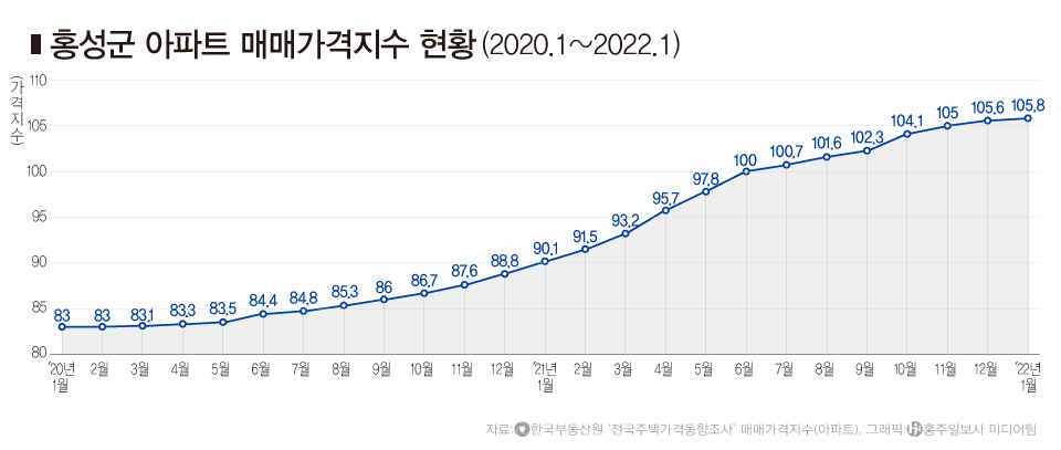 한국부동산원의 ‘전국주택가격동향조사’ 시군구별 아파트 매매가격지수 통계에 따르면 지난 1월 홍성의 아파트 매매가격지수(기준월: 2021.06=100)는 105.8로 2년 전인 2020년 1월 매매가격지수인 83보다 22.8p나 높은 수치를 기록했지만, 전월대비 변동률은 0.22%에 그쳤다. 관내 아파트 매매가격지수 전월대비 변동률이 0.3%보다 낮은 수치가 나온 건 지난 2020년 4월 0.15% 이후 1년 9개월만이다.