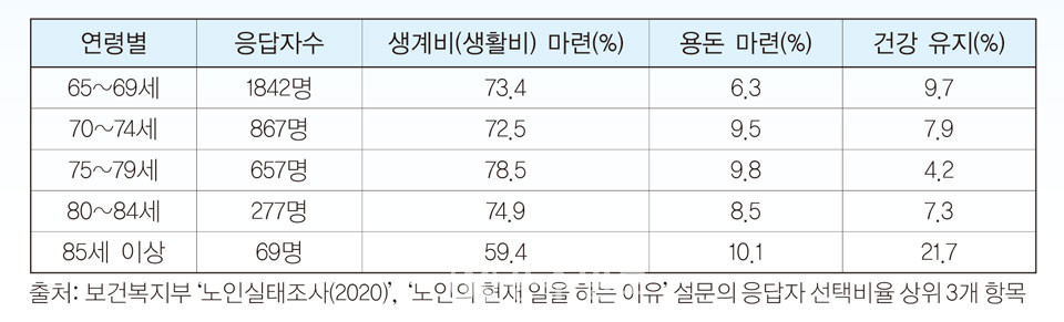 보건복지부가 실시한 ‘노인실태조사(2020)’, ‘노인의 현재 일을 하는 이유’ 항목의 연령별 응답 결과를 보면 65세 이상의 모든 연령대에서 생계비(생활비) 마련을 가장 많이 선택한 것을 확인할 수 있다. 연령대별 집단 중 85세 이상 집단에 속한 응답자들은 생계비(생활비) 마련 59.5%, 건강 유지 21.7%, 용돈 마련 10.1%를 선택해 생계비 마련을 선택한 비율이 모든 연령대 중 가장 낮았다. 전체 응답자 3712명의 소계는 생계비(생활비) 마련이 73.9%(1위), 건강 유지가 8.3%(2위), 용돈 마련이 7.9%(3위) 등이었다. 또한 동일 조사 내 ‘노인의 부담이 되는 지출’ 항목을 살펴본 결과 식비 46.6%(1위), 주거관련비 22.3%(2위), 보건의료비 10.9%(3위) 순으로 나타났다. 우리나라의 수많은 노인들이 먹고 사는 것에 경제적 부담을 느끼고 있었고, 생계비 마련을 위해 취업 전선에 뛰어들고 있다.