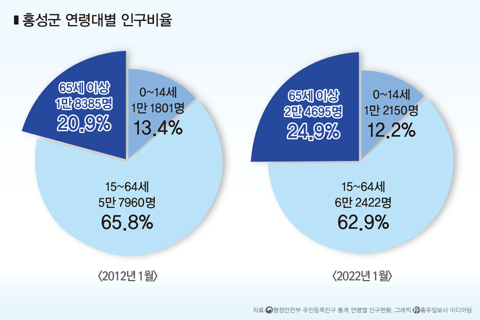 홍성은 이미 오래 전 고령화율 20%를 넘기고 초고령사회로 진입했다. ‘행정안전부 주민등록통계, 연령별 인구현황’에 따르면 지금으로부터 10여 년 전인 2012년 1월 홍성의 65세 이상 인구는 1만 8385명으로 당시 총인구(8만 8146명)의 20.9%를 차지하고 있었다. 10년이 지난 2022년 1월 홍성의 65세 이상 인구는 10년 전에 비해 6310명이 늘어난 2만 4695명, 총인구는 9만 9267명으로 확인됐다. 홍성의 고령화율은 2012년 1월 20.9%에서 2022년 1월 24.9%로 4%p 증가했다.