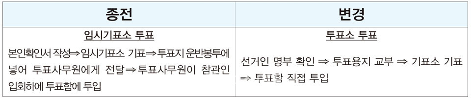 확진자 등은 6시 이후 일반 유권자들이 투표를 마치고 모두 퇴장한 후 해당 투표소에서 일반 유권자와 동일한 방법으로 투표한다. 종전 임시기표소에서 투표사무원에게 전달해 투표하던 방법과 달리 확진자 등은 자신이 기표한 투표지를 직접 투표함에 투입하게 된다.