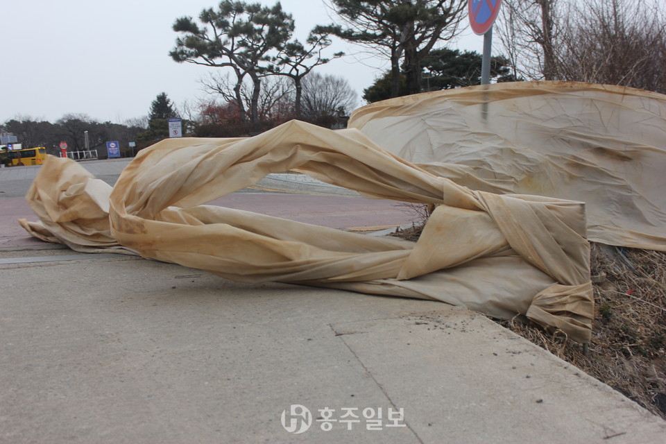 홍북읍행정복지센터 인근 버스 정류장에서는 한 대선후보자의 선거홍보 현수막이 줄이 끊어진 채 펄럭이고 있는 장면이 목격됐고<사진>, 결성면 읍내리 인근 도로에서 전봇대 기둥에 둘둘 감긴 현수막이 발견됐다는 제보도 이어졌다.