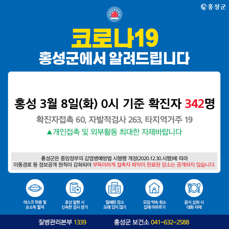홍성 3월 8일(화) 0시 기준 확진자 342명(확진자접촉 60, 자발적검사 263, 타지역거주 19) 개인접촉 및 외부활동 최대한 자제바랍니다. Tag #홍성군 #코로나19 #확진자 #발생 저작권자 © 홍주일보 무단전재 및 재배포 금지 홍주일보 다른기사 보기 페이스북 카카오톡 URL복사 기사공유하기