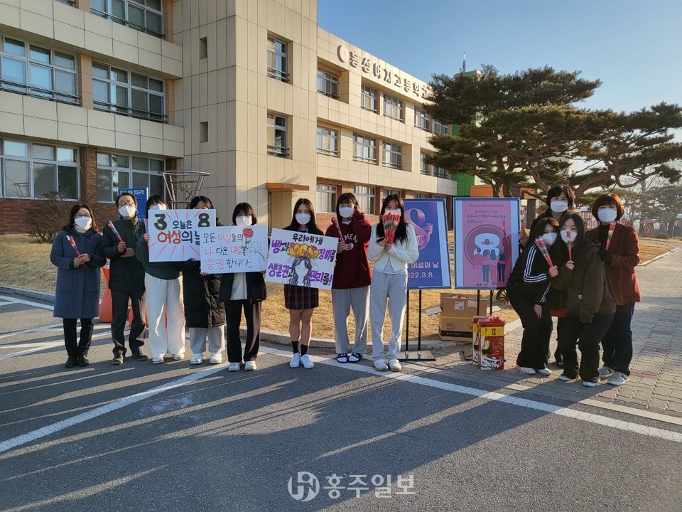 홍성여고 학생회는 세계 여성의 날 기념행사로 학생들이 직접 관련 피켓을 제작하고 전교생에게 장미와 간식을 전달하는 등교 캠페인을 진행했다.