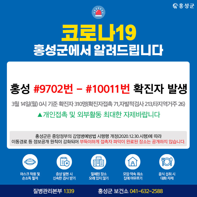 3월 14일(월) 0시 기준 확진자 310명(확진자접촉 71, 자발적검사 213, 타지역거주 26)