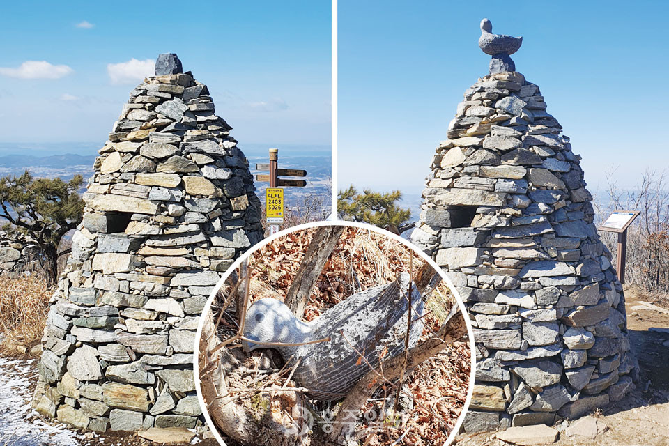 본지 제727호(2월 24일자 8면) “‘평화통일기원탑’ 오리상 사라져” 제하의 기사로 보도된 ‘사라진 오리상’이 제자리로 돌아왔다. 광천 오서산 정암사에서 1600계단을 올라가면 만날 수 있는 평화통일기원탑은 복성규 씨가 혼자 7년간 지게로 돌을 날라 지난해 10월 완공한 탑이다.