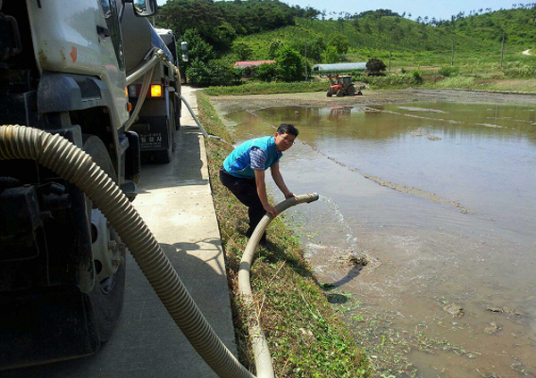 한국수자원공사 충청지역본부는 지난 27일 극심한 가뭄으로 고통을 받고 있는 서부면, 결성면, 장곡면 등 3개 지역에 살수차 3대(15톤 1대, 16톤 2대)와 1.8리터 병물 1800병을 투입하여 말라가는 농작물에 농업용수를 공급하고 식수를 지원했다.